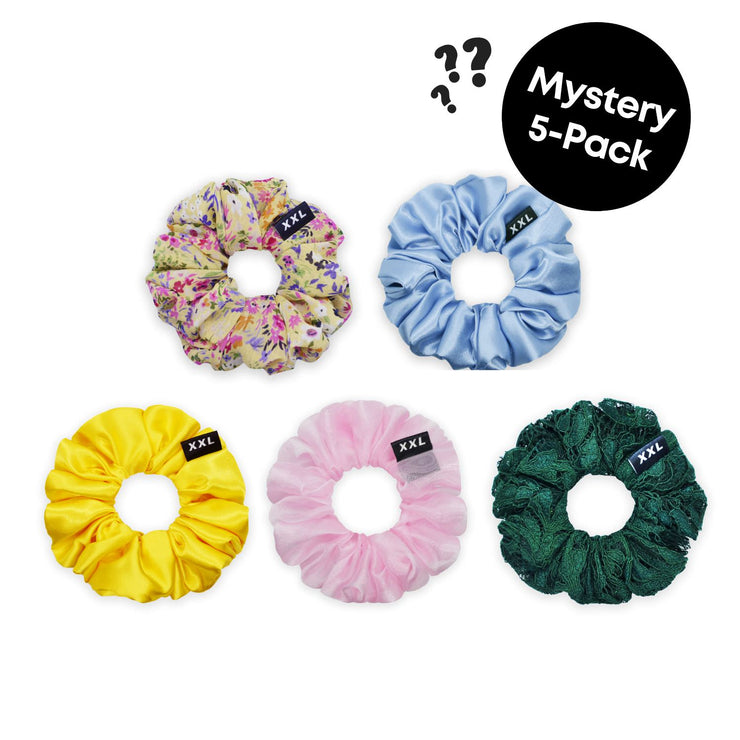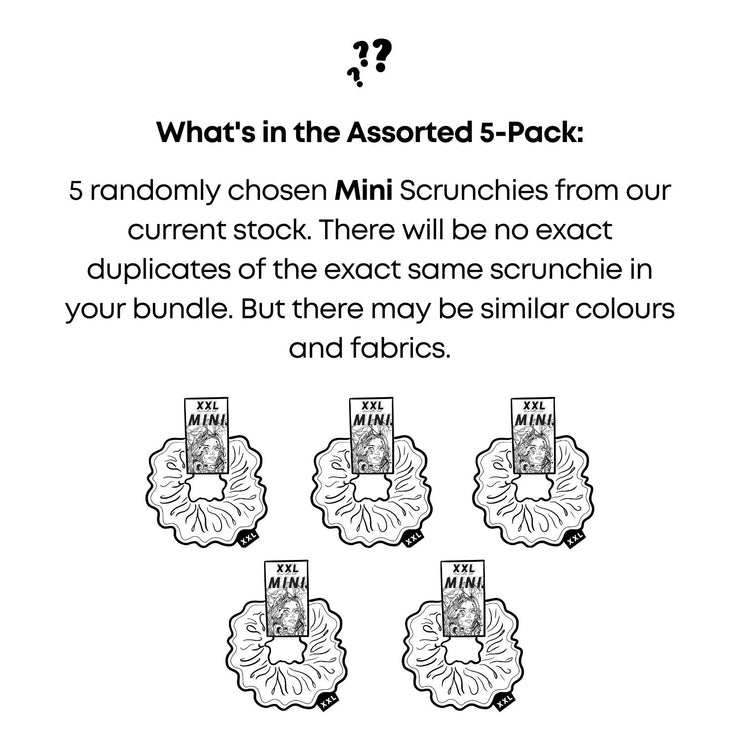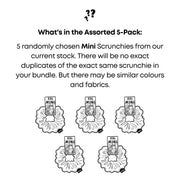 Our mystery 5-pack includes five randomly chosen handmade mini scrunchies that we know you'll love. Keep your hair up wherever life takes you. Take a chance with our mystery bag and SAVE!